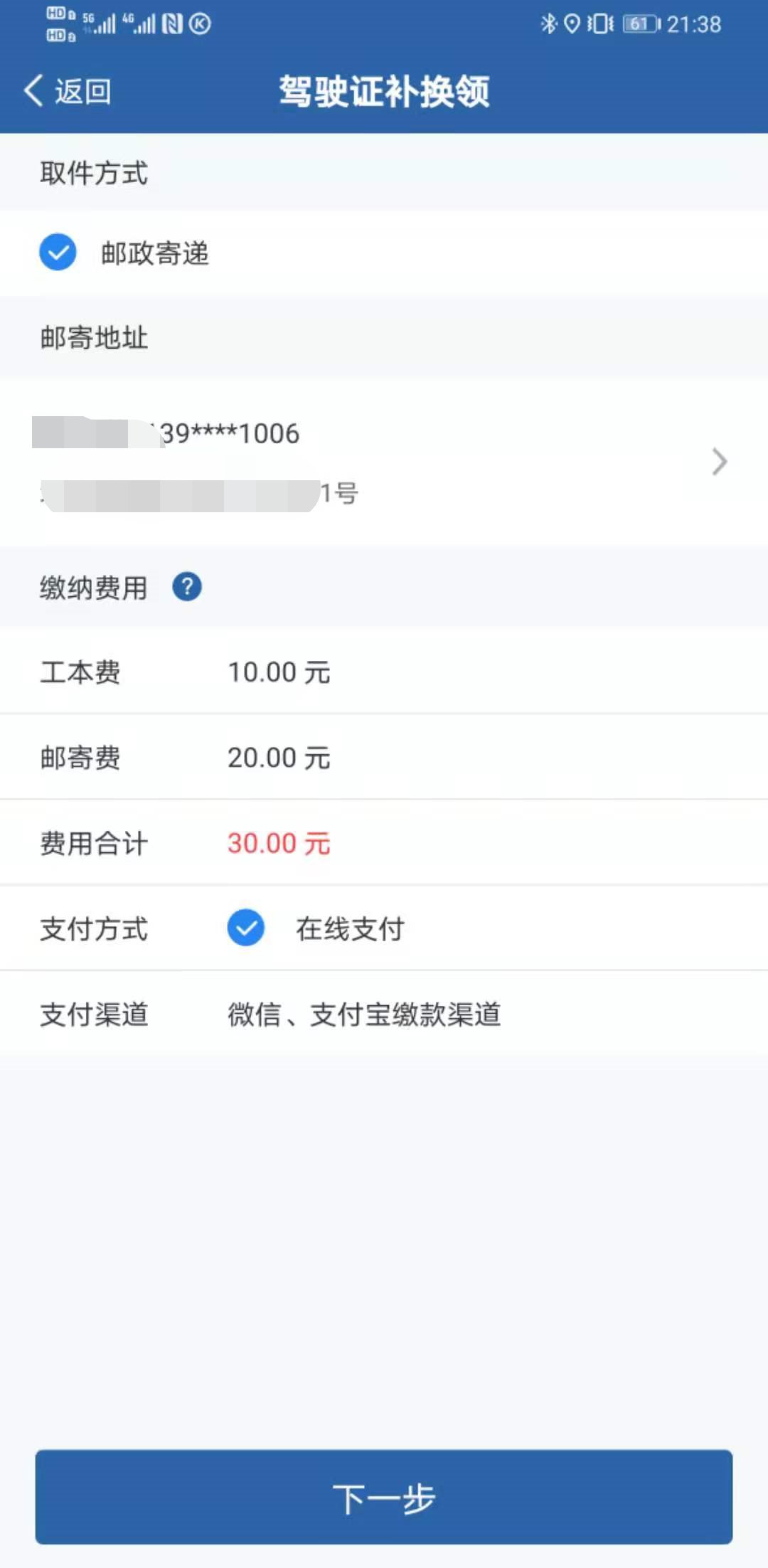4、输入获取的验证码,点击【提交】,选择支付方式后完成缴款,损毁换领驾驶证业务即提交成功。用户可通过【首页】→【网办进度】功能随时查看业务办理进度。