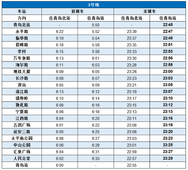 3号线青岛北站末班车始发时间延后至22:45。