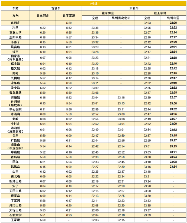 1号线东郭庄站非全程末班车(终到山里)始发时间延后至22:20。