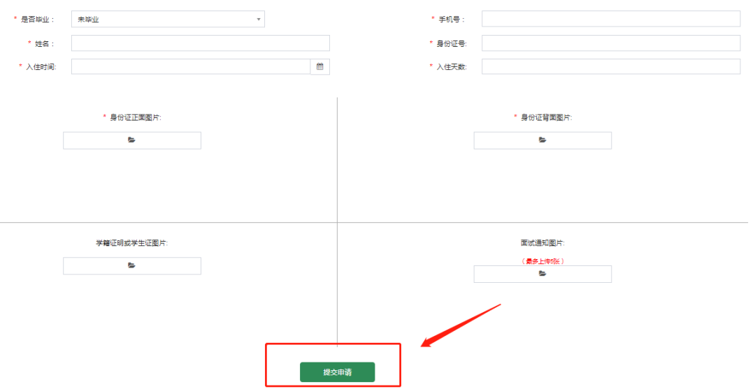 第五步:按照要求填写相关信息,并上传身份证正反面、毕业证、学生证、学籍证明、面试通知等图片,点击“提交申请”即可完成申请。