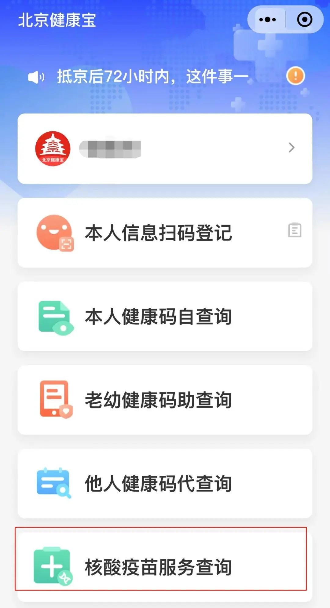 特别提醒,进京需要准备48小时内核酸检测阴性证明,请计划好核酸检测时间,京外地区的核酸检测结果需点击北京健康宝中“核酸疫苗服务查询”→“查询外省市核酸检测结果并上传健康宝”后才能在北京健康宝中显示。