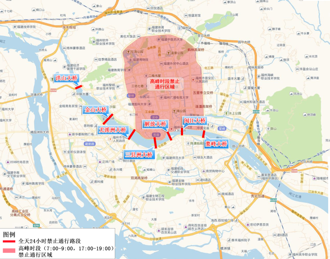2、高峰时段(7:00-9:00,17:00-19:00)禁止在鼓楼、台江、晋安区二环(不含)以内区域道路通行。