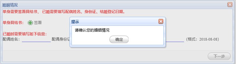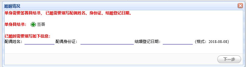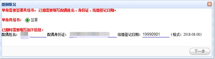 在点下一步之前需要确认婚姻情况,单身需要签署单身具结书;已婚需要填写配偶信息以及结婚登记日期: