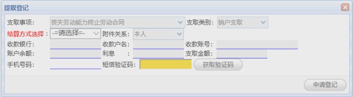 【下一步】后会打开登记界面,录入支取金额、获取并填写验证码,点【申请登记】:
