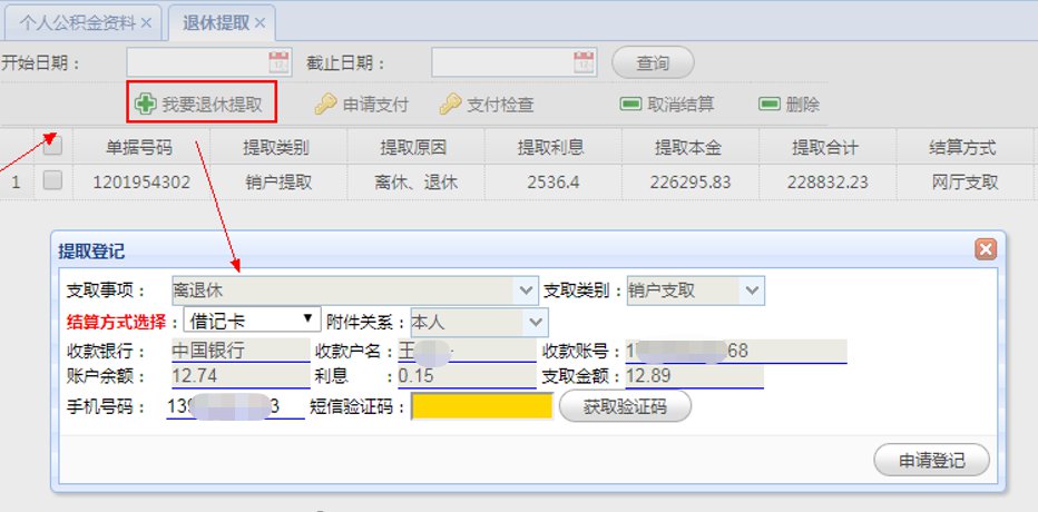 根据实际业务点左侧菜单“归集业务办理à提取”中具体的提取办理界面: