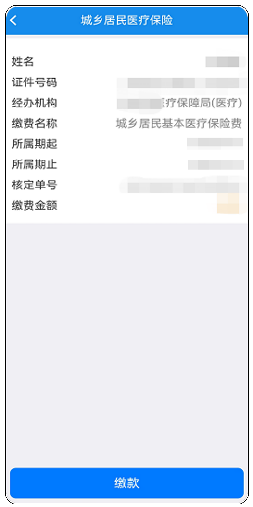 3、第三步:系统自动提取当前登录自然人的城乡居民医疗保险登记信息及核定信息,确认无误后,点击“缴款”,完成支付即可。