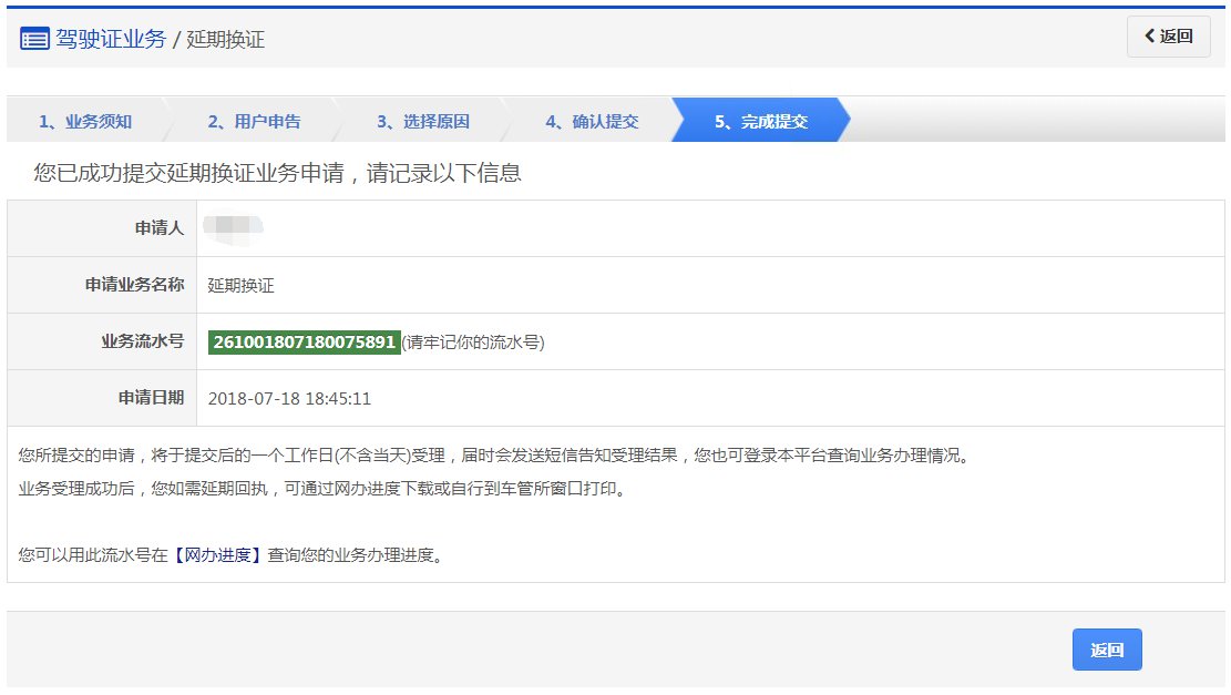 该步骤提交成功后,系统生成业务流水号。该步骤提交成功后,系统将于提交后的一个工作日(不含当天)受理,届时会发送短信告知受理结果。用户可以根据该业务流水号在网办进度中查询业务办理进度。办理成功后,用户如需延期回执,可通过网办进度下载或自行到车管所窗口打印。