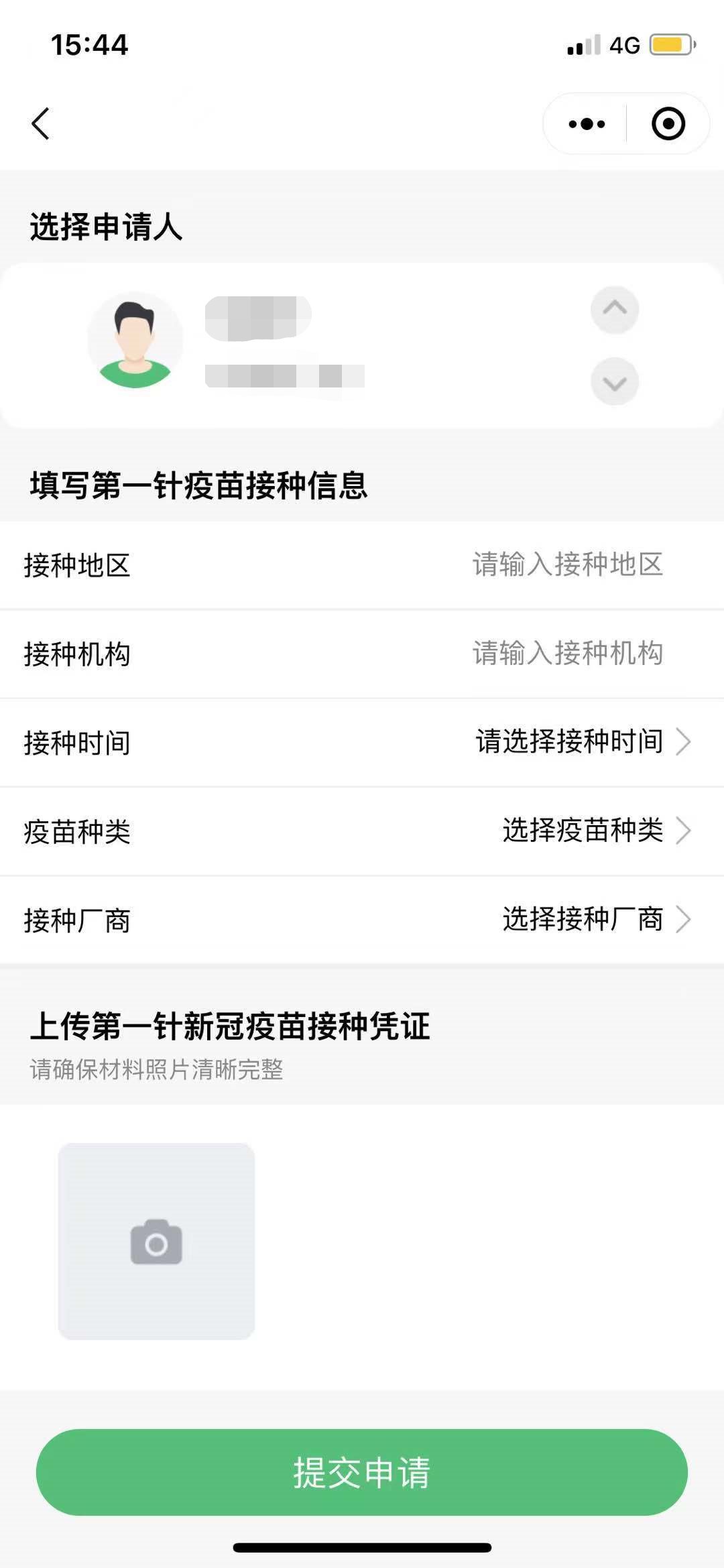2、填写相关信息(接种地区、接种机构、接种时间、接种种类、接种厂商、上传第一针新冠疫苗接种凭证),然后点击提交申请即可。