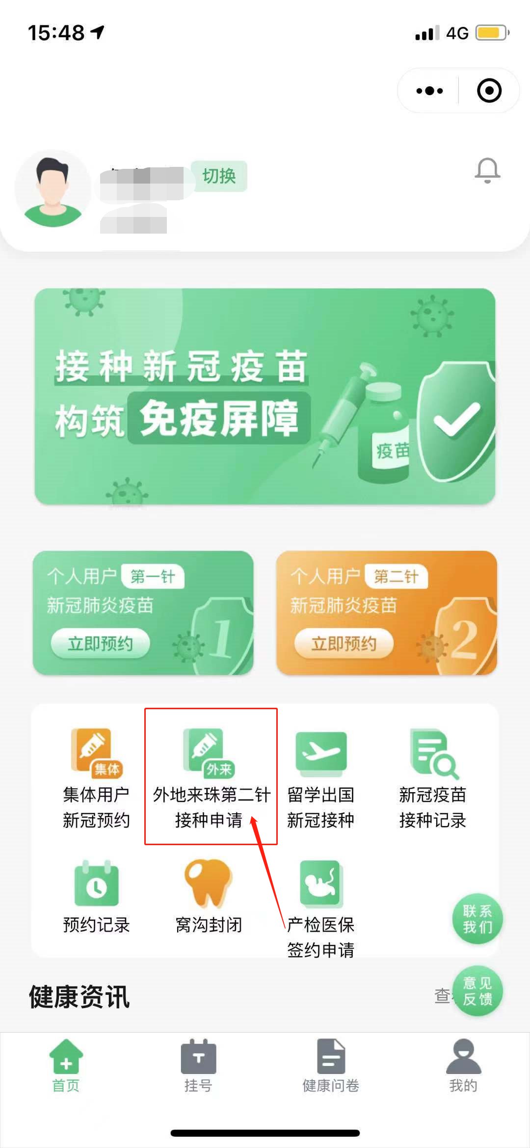 1、进入预约入口后,选择【外地来珠第二针接种申请】