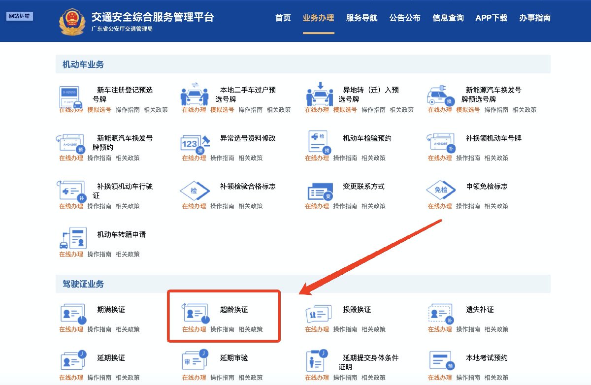 获取《机动车驾驶人身体条件证明》后,用户登录互联网服务平台后,点击【驾驶证业务】→【超龄换证】业务功能办理。