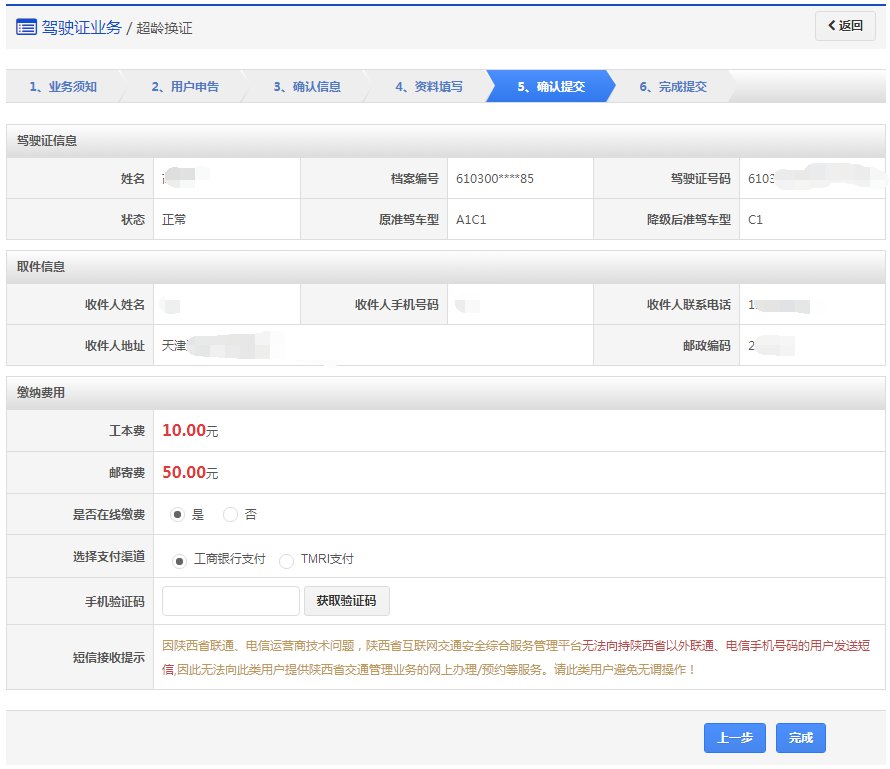 再次确认信息以后,点击【获取验证码】,系统会发送6位验证码到用户绑定的手机,用户输入手机验证码后,点击【完成】,进入步骤6【完成提交】。如果选择在线支付,提交后自动跳转至支付页面进行网上付款。