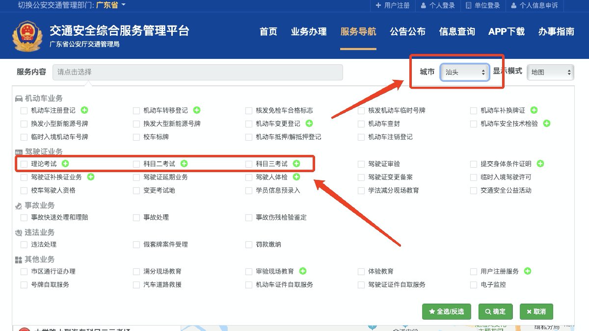 在网站导航中选择【服务导航】进入选择服务内容,将城市选为【汕头】即可查询相应信息。