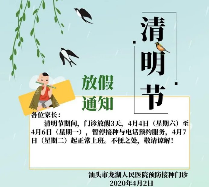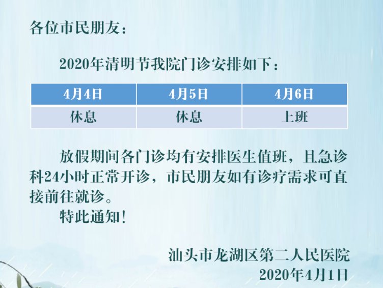 2020年4月4日至4月6日清明节放假调休,期间我院将继续坚持“无假日医院”服务,门诊照常开诊。