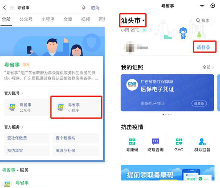 第一步:进入“粤省事”小程序系统页面后,选择左上角所在地“汕头市”,然后登录、输入信息关联您的社保卡。