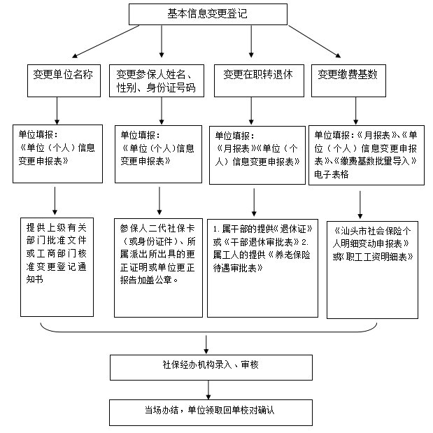 3.变更在职转退休:参保单位填写《汕头市城镇职工基本医疗保险费申报月报表》,属干部的提供《退休证》或《干部退休审批表》;属工人的提供《养老保险待遇审批表》;