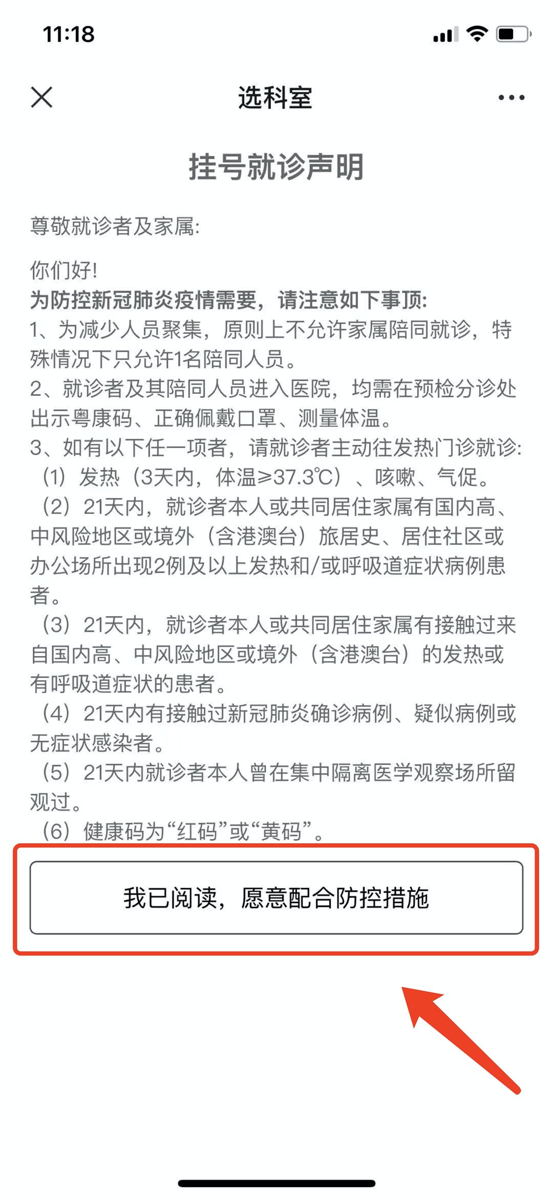 2.阅读挂号就诊声明,点击【我已阅读,愿意配合防控措施】。