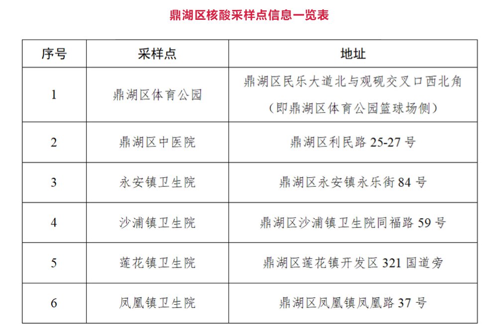 根据当前疫情防控形势,为进一步加强涉疫地区来(返)鼎人员健康管理,减少疫情输入风险,区新冠肺炎防控指挥部办公室决定,3月13日以来(含3月13日)有省外、省内涉疫地市(广州市、深圳市、东莞市、珠海市、中山市、汕尾市、茂名市、清远市、韶关市)、肇庆市高要区金利镇旅居史的来(返)鼎人员,于3月28日上午8时—10时,凭我区各镇(街道)、各有关单位出具的《涉疫地区来(返)鼎人员免费核酸检测凭证》,到我区6个核酸采样点(附后)进行一次免费核酸检测。