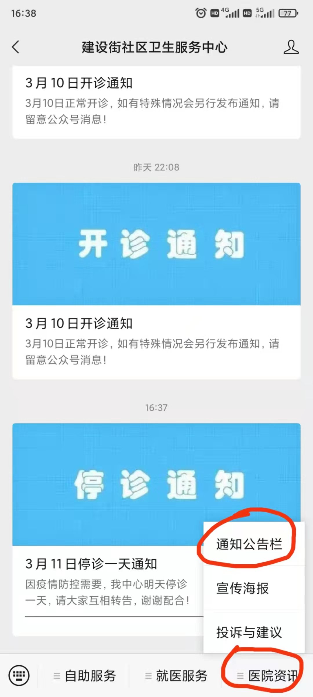 如有特殊情况会另行发布通知,请留意建设街社区卫生服务中心公众号右下角,医院咨询-通知公告栏消息!