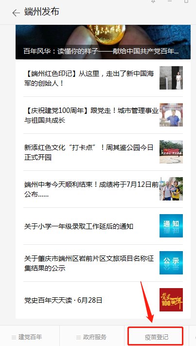 进入“端州发布”微信公众号,点击菜单栏“疫苗登记”