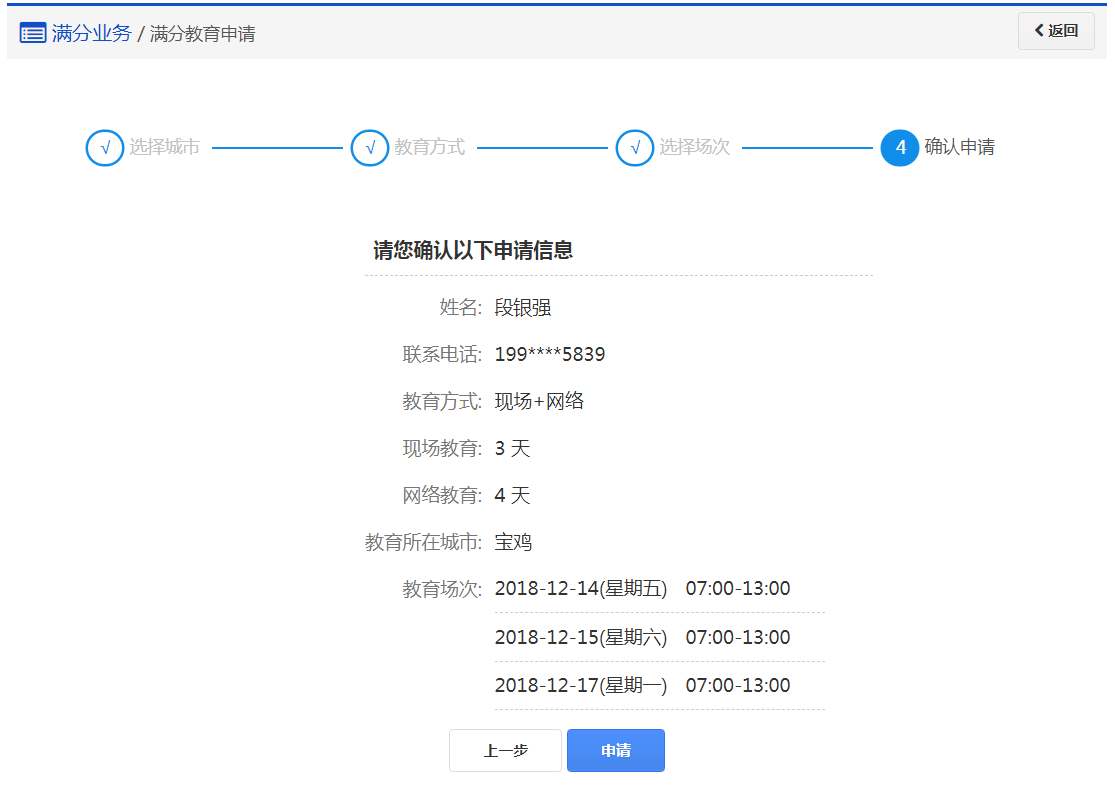 步骤5:【申请成功】在该步骤,用户已申请成功,请在规定的时间内参加相应的教育场次完成满分教育。