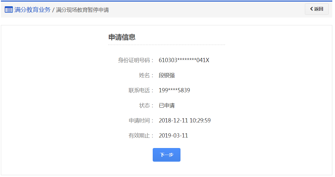步骤1:【申请信息】点击【满分现场教育暂停申请】,进入步骤1:【预约满分申请】。查看我的申请信息,点击“下一步”后进入步骤2。