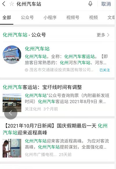 1、首先打开微信搜索并关注“化州汽车站”公众号