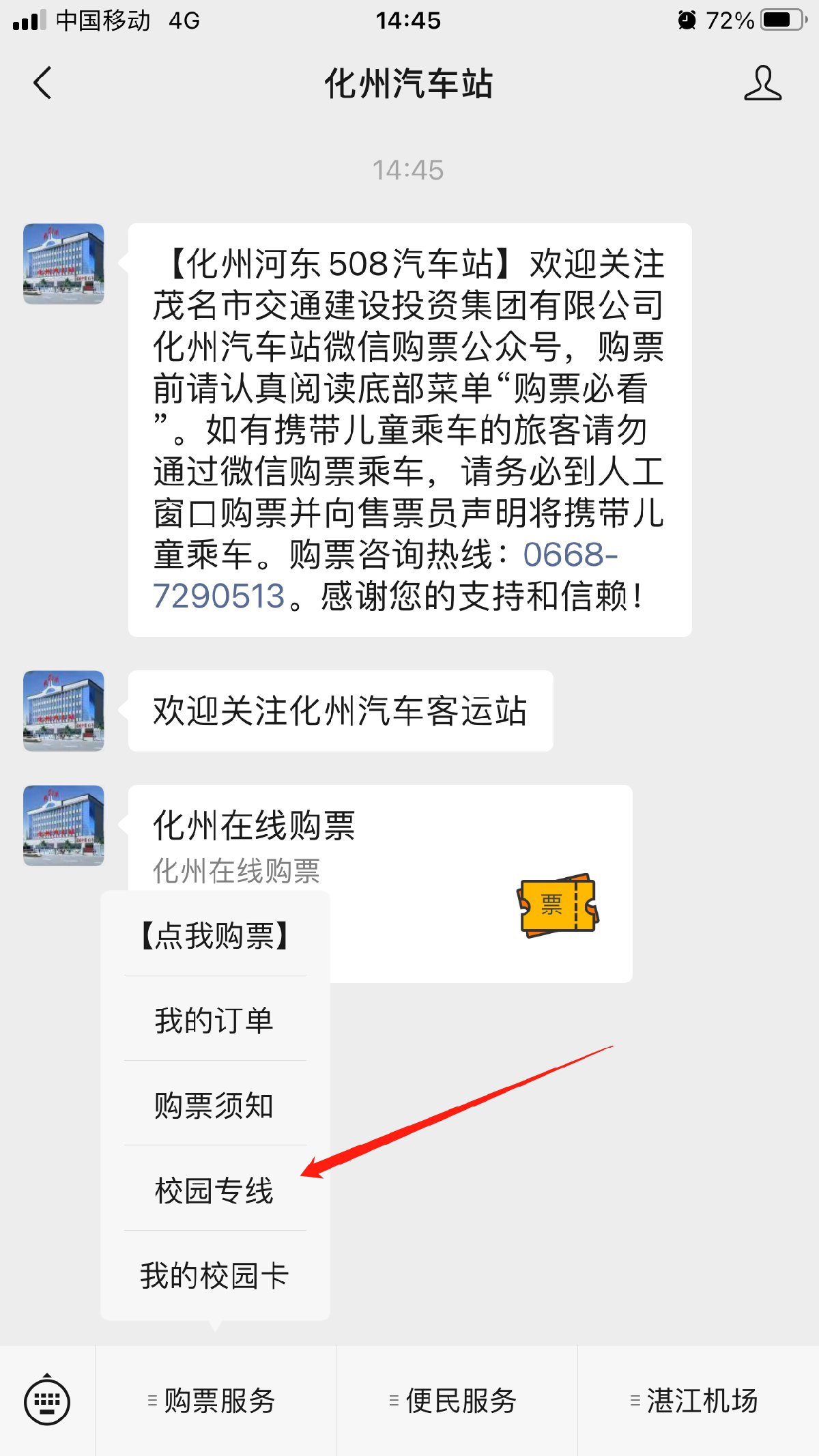 2、进入公众号—购票服务—校园专线