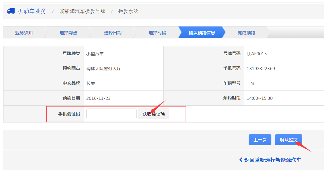在该步骤,会显示用户换牌预约的详细信息,用户需核对预约信息,在确认信息正确无误后,点击【获取验证码】,会向手机发送一条验证短信,输入收到的验证码,点击【确认提交】,进入步骤7。