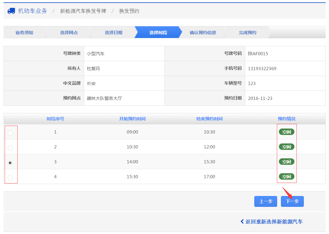 在该步骤,用户可以根据个人情况选择换牌预约的时间段。选择后,点击【下一步】,进入步骤6。