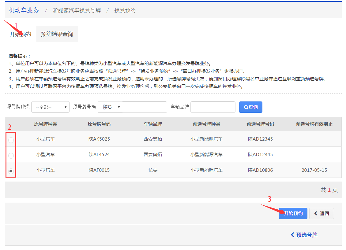 在该步骤,用户必须选择一辆本人本单位已选号的新能汽车,点击【开始预约】,进入新能源汽车换牌预约业务办理流程。