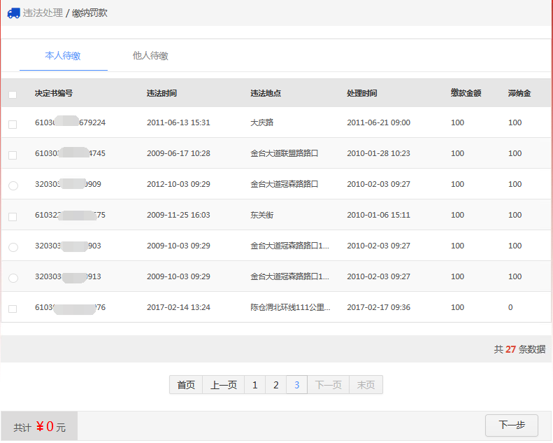 在该步骤,用户选择需要缴款的违法记录。
