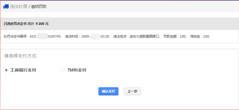 在该步骤,用户需认真确认需要缴款的违法记录,点击“确认支付”按钮,跳转至支付平台进行支付。