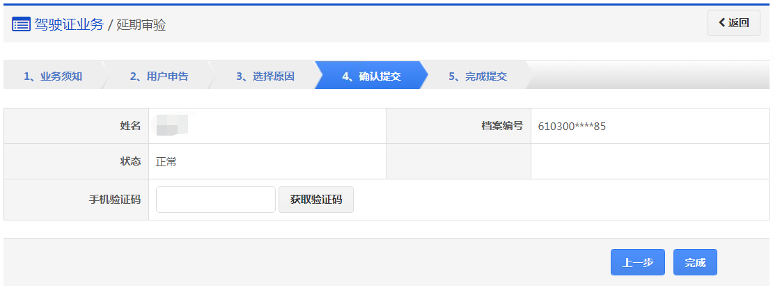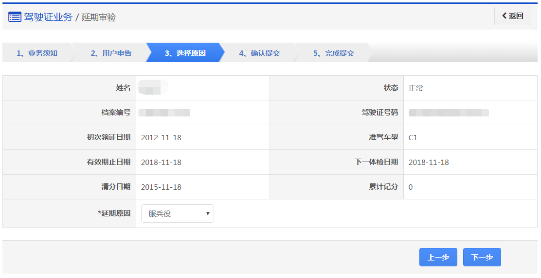 在该步骤,界面显示驾驶证的基本信息,用户认真确认各项信息无误后选择延期原因,点击【下一步】进入步骤4【确认提交】。