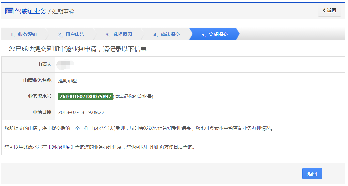 该步骤提交成功后,系统生成业务流水号。该步骤提交成功后,系统将于提交后的一个工作日(不含当天)受理,届时会发送短信告知受理结果。用户可以根据该业务流水号在网办进度中查询业务办理进度。办理成功后,用户如需延期回执,可通过网办进度下载或自行到车管所窗口打印。