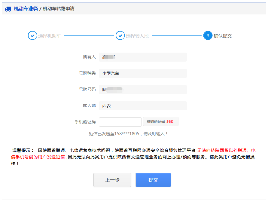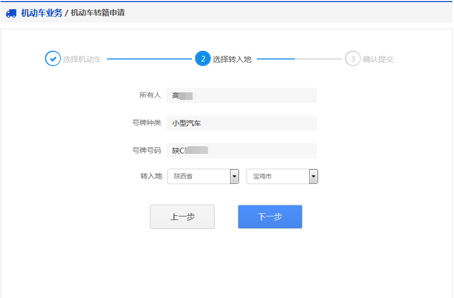 该步骤显示用户的车辆信息、转入地信息。