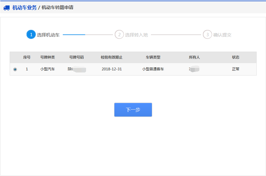 用户选择已备案的本人机动车,如下图所示。选择完成后,点击【下一步】,进入步骤2【选择转入地】。