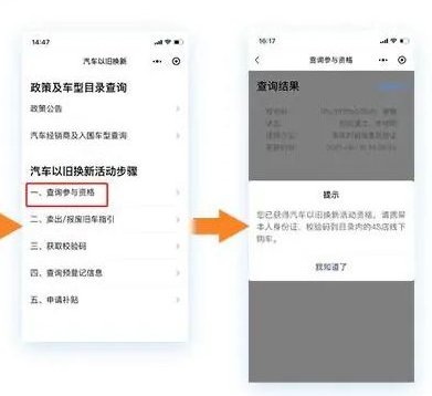 2、第二步:进入“汽车以旧换新”栏目(官方唯一查询渠道),查询是否属于补贴对象范围