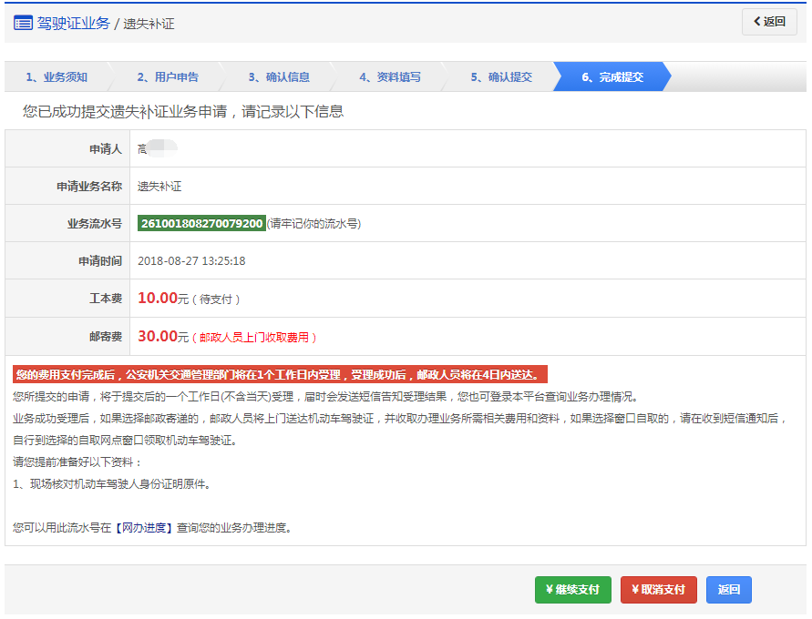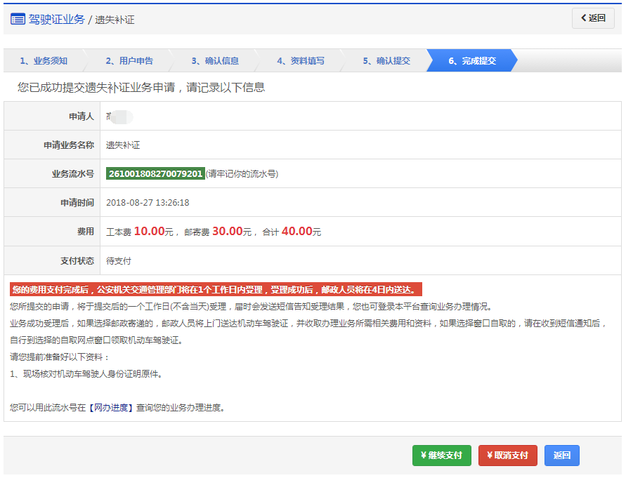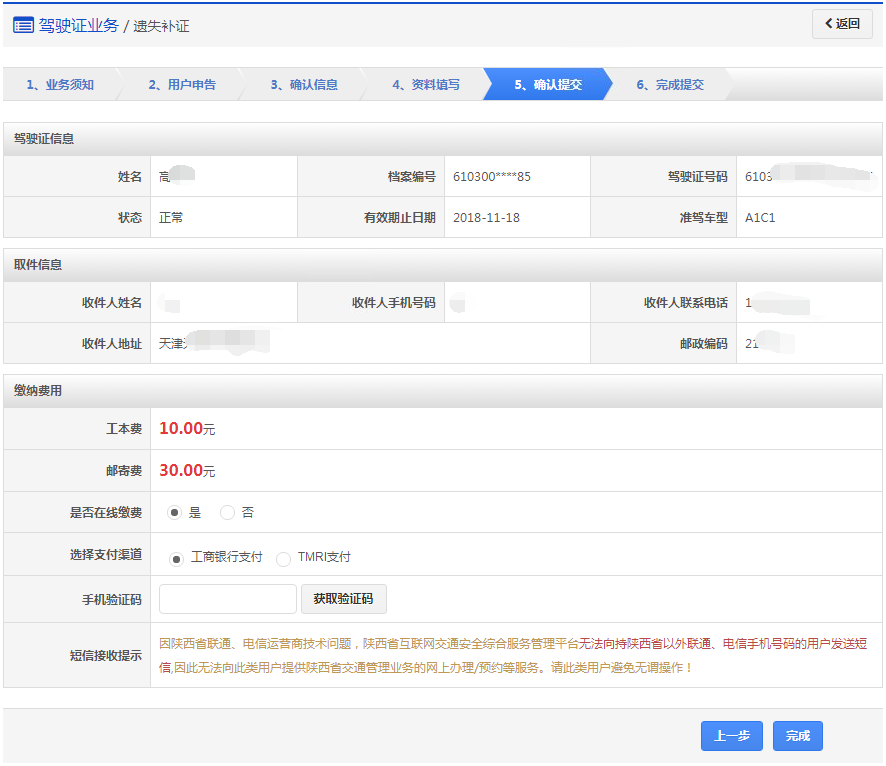 步骤5:【确认提交】该步骤显示用户的驾驶证信息、领取详情以及需要缴纳费用信息,如果平台已开通在线支付功能,显示在线支付详情。