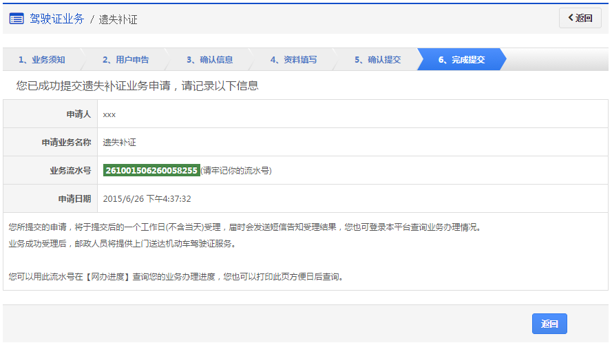 步骤6:【完成提交】该步骤提交成功后,系统生成业务流水号。该步骤提交成功后,系统将于提交后的一个工作日(不含当天)受理(选择在线支付的业务费用支付完成后受理),届时会发送短信告知受理结果。用户可以根据该业务流水号在网办进度中查询业务办理进度。