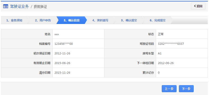 步骤3:【确认信息】在该步骤,界面显示驾驶证的基本信息,用户认真确认各项信息无误后,点击【下一步】进入步骤4【资料填写】。