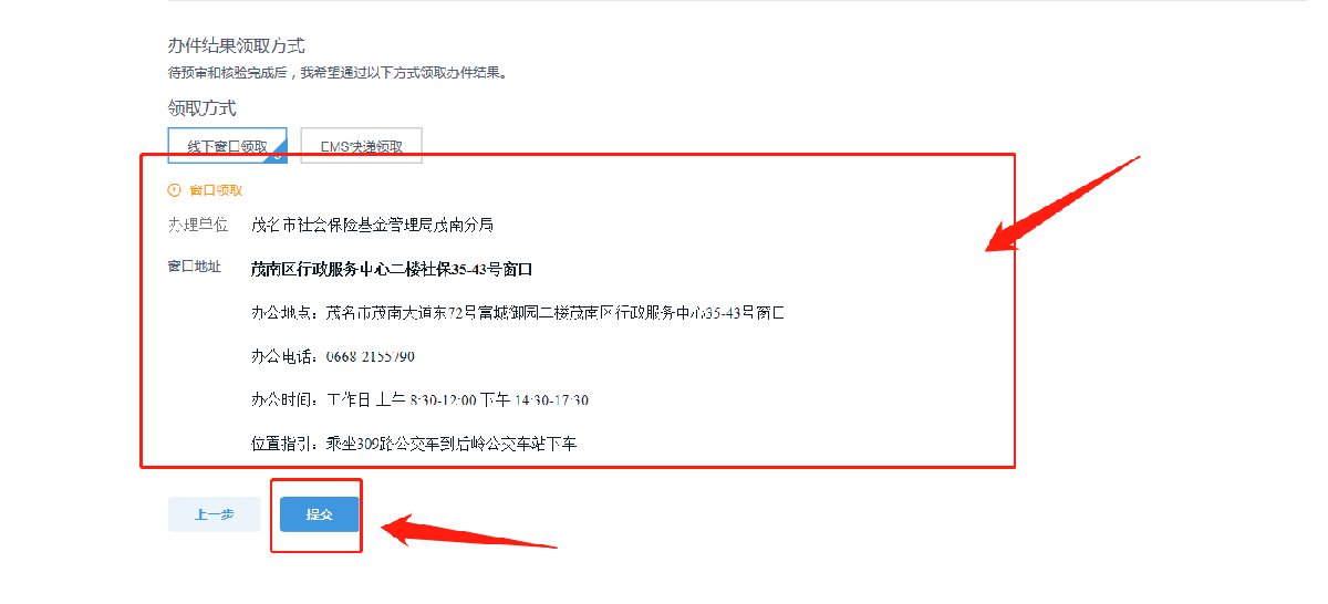 【第四步】上传相关材料电子版,选择受理结果领取方式,可以选择邮寄(需要填写个人地址和联系方式)或者到办理网点现场领取,根据你选择办理的区县,系统会默认给你确认一个领取地点。