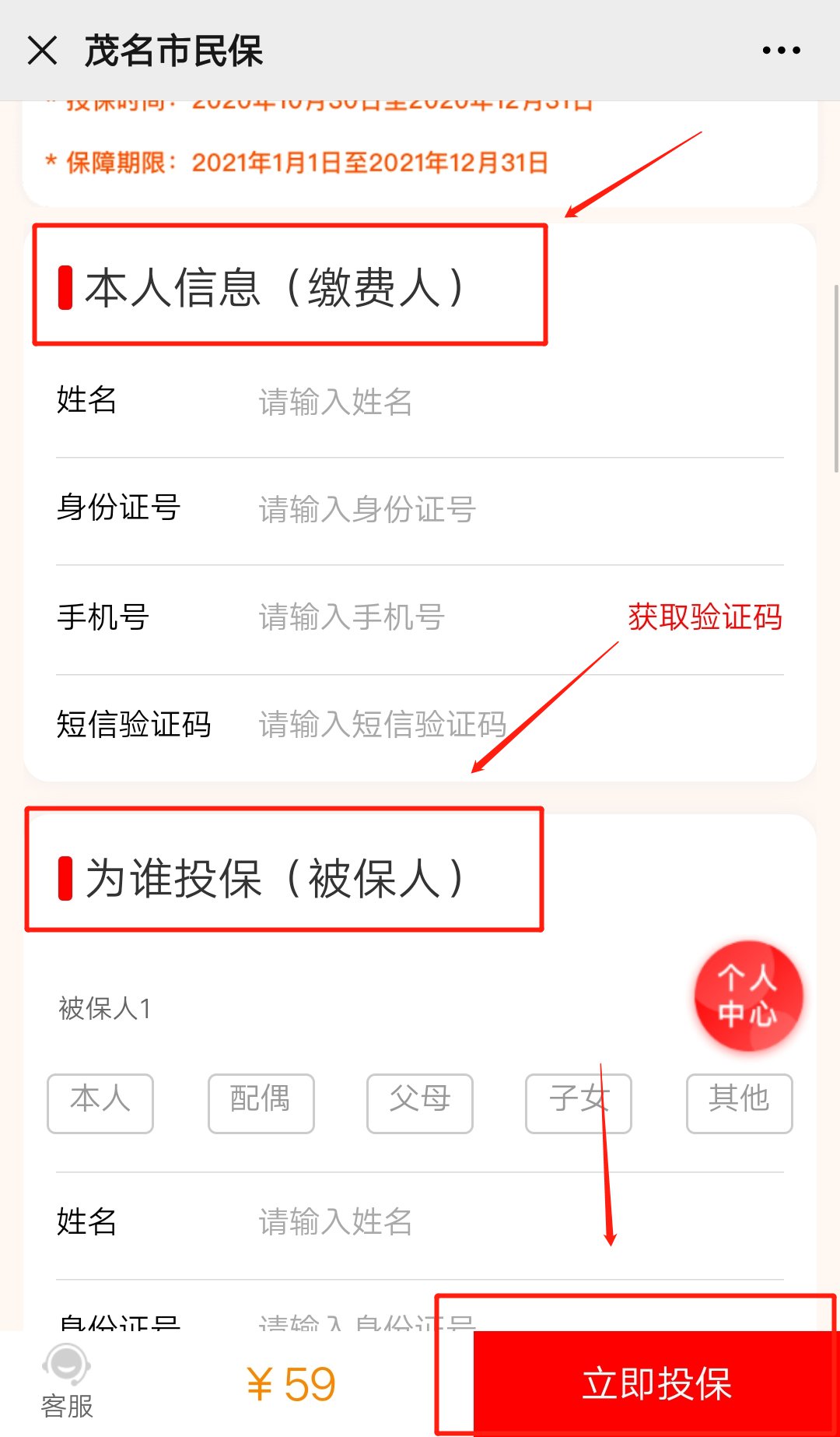 参保流程:填写【缴费人】和【被保人】信息→再按照系统操作即可投保。【备注:市民保属于社会基本医疗保险的一项补充保险,要确认参保人确实参加了社会基本医疗保险才能正常投保。(茂名社会基本医疗保险包括城镇居民医保和城乡居民医保)】