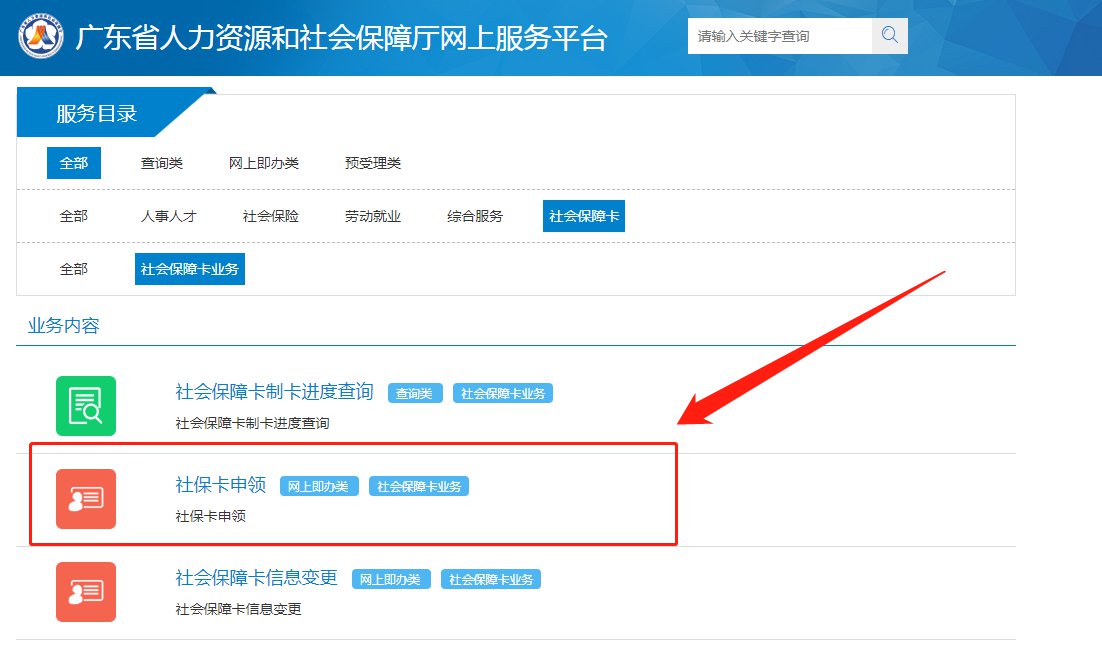 第一步:在主页面【服务目录】处,选择【社会保障卡】继而点入【社会保障卡业务】。