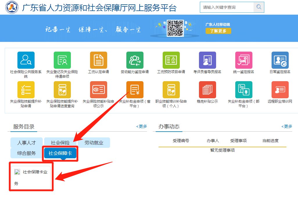 第一步:在主页面【服务目录】处,选择【社会保障卡】继而点入【社会保障卡业务】。
