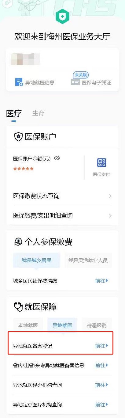 2.点击“医保”进入“梅州医保业务大厅” → “就医保障”中的“异地就医” →“异地就医备案登记”。