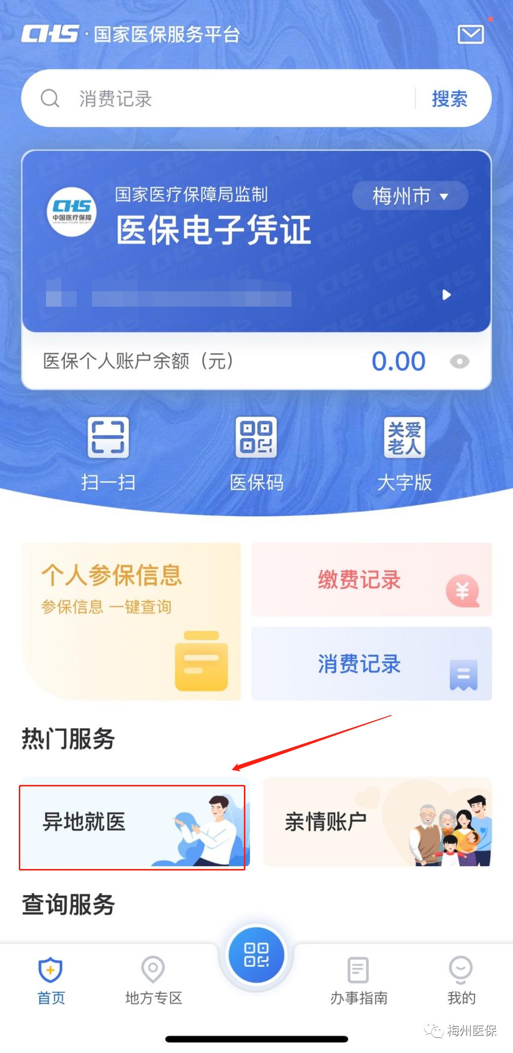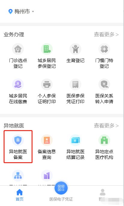 2.点击“医保”进入“梅州医保业务大厅” → “就医保障”中的“异地就医” →“异地就医备案登记”。