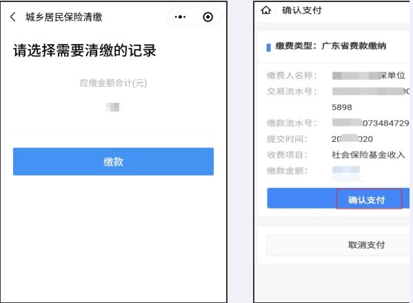 6、在“城乡居民保险清缴”界面中,会自动弹出应缴城乡居民医保费,点击“缴款”后,出现温馨提示,点击阅读完毕,核对信息后点击“确认支付”即可完成城乡居民在线缴费。