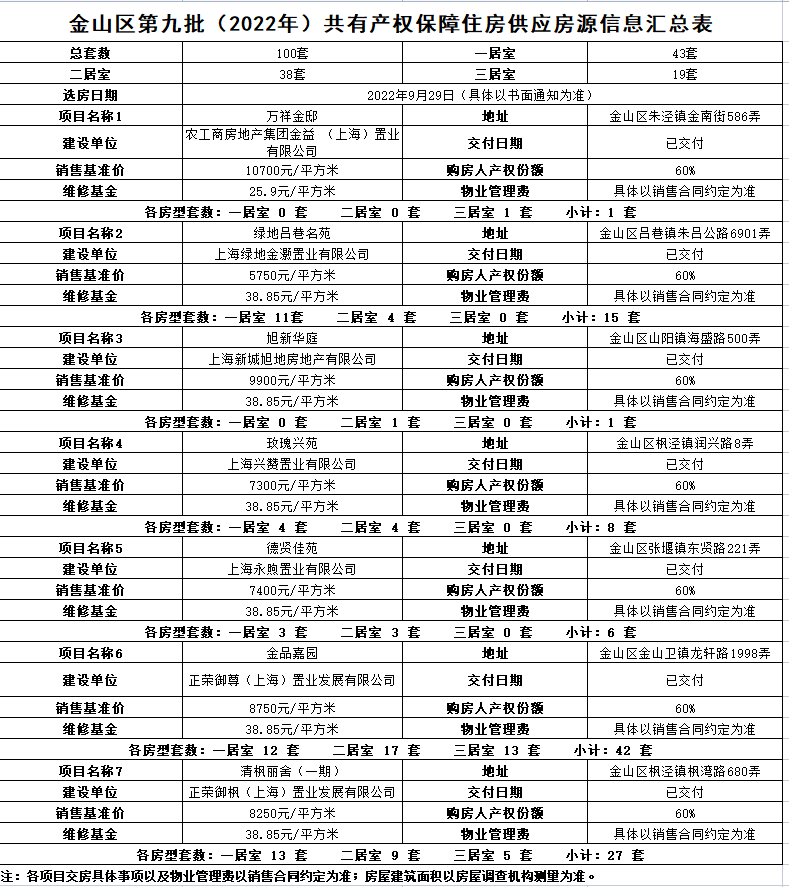 根据上海市共有产权保障住房的有关规定,现将金山区第九批(2022年)共有产权保障住房房源公示如下
