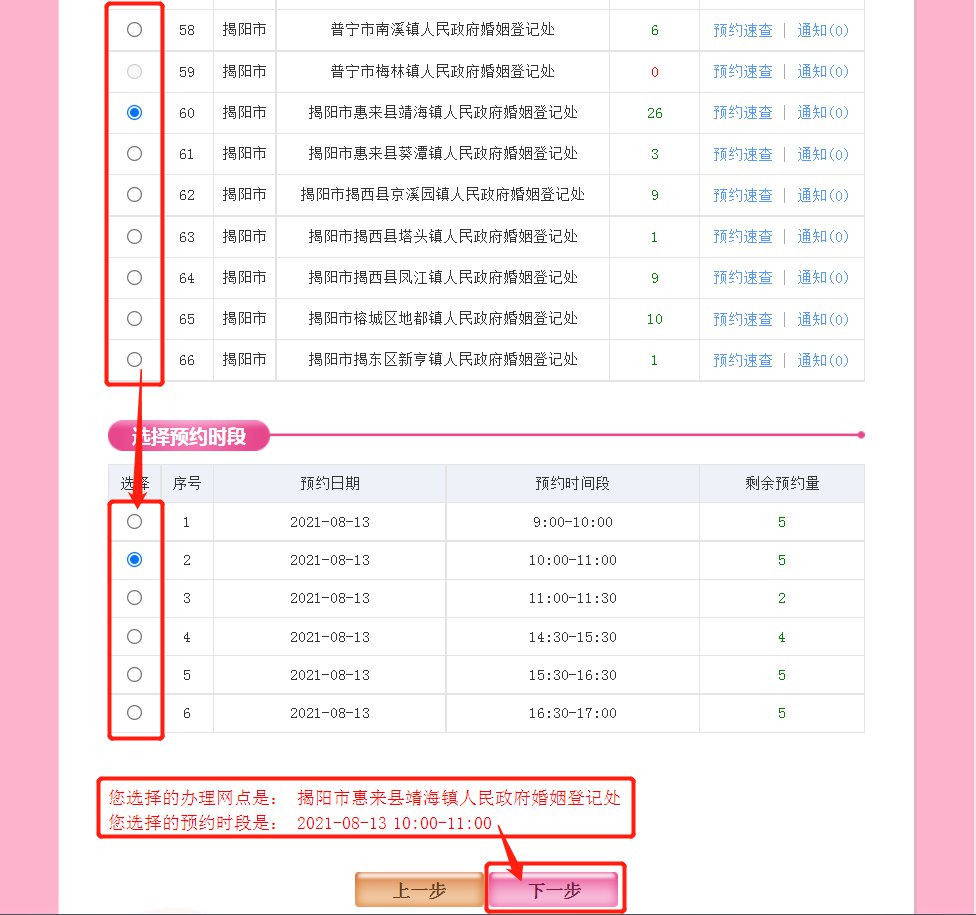 5.选择婚姻登记处、预约时段,阅读红字确认办理网点及预约时段无误后点击“下一步”。