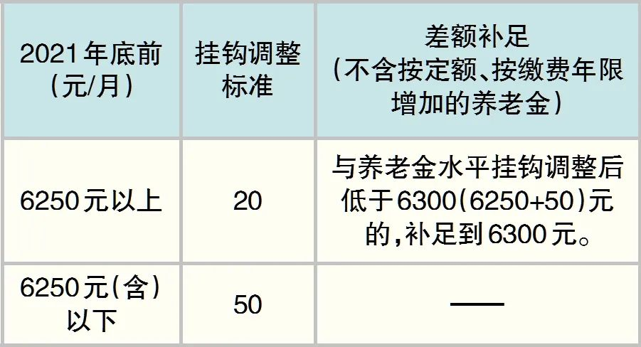 按照退休人员2021年底前的月基本养老金水平,以2021年本市居民人均可支配收入水平(6250元)为基准线划分两档,6250元以上的每人每月增加20元,6250元(含)以下每人每月增加50元。